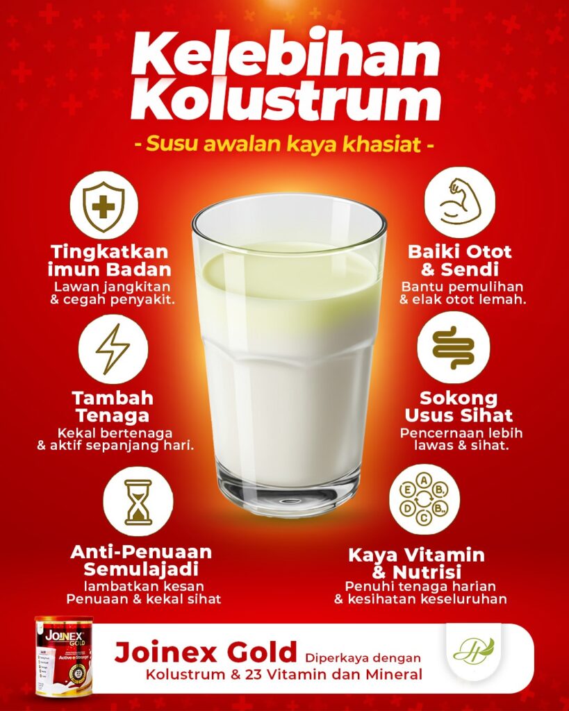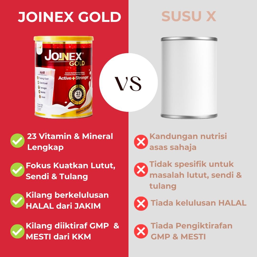 Joinex Gold diformulasi khas untuk kesihatan tulang & sendi, mengandungi lebih banyak kolagen, kolostrum, dan nutrisi tambahan yang tidak terdapat dalam susu biasa.
