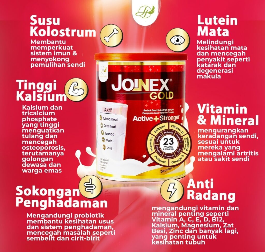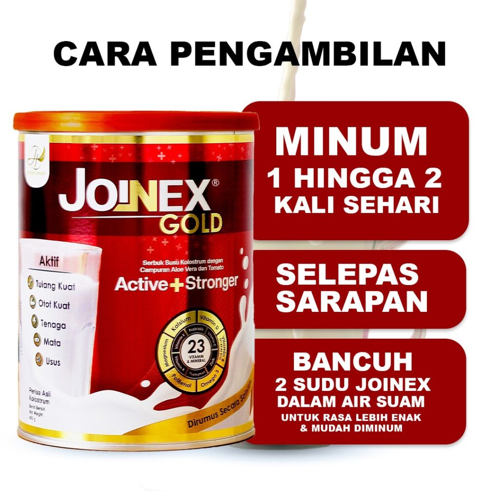 Joinex Gold adalah susu khas yang diformulasikan dengan 23 nutrisi penting, termasuk kolostrum, kalsium dan vitamin D, untuk membantu menguatkan tulang, sendi, dan otot.
