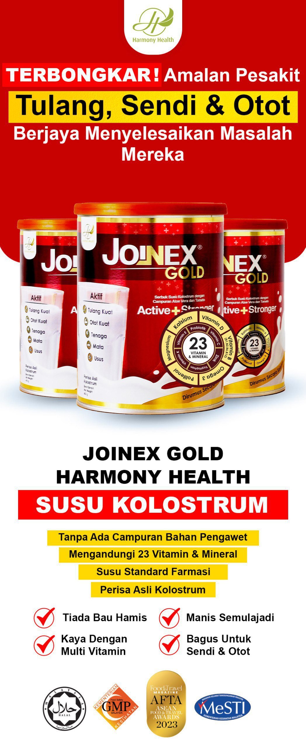 Ya! Dengan gabungan kolagen, kalsium, dan vitamin D, Joinex Gold membantu mengurangkan keradangan, meningkatkan fleksibiliti sendi, dan menguatkan tulang.