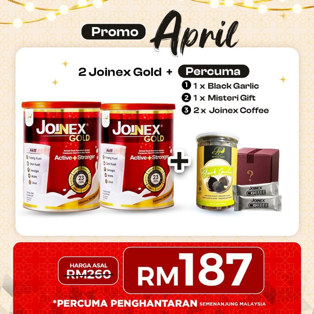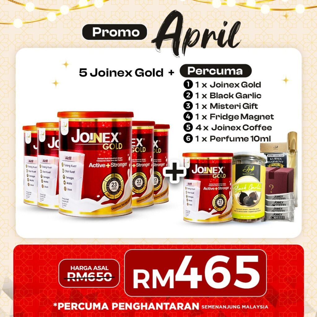 PENAFIAN: Keberkesanan produk Joinex Gold bergantung kepada kesesuaian individu. Setiap hasil daripada penggunaan adalah berbeza bagi setiap pengguna. Produk ini akan memberi kesan terbaik sekiranya diamalkan secara konsisten dan mengikut cara penggunaan yang disarankan, berdasarkan banyak testimoni yang telah diperoleh. Kita hanya berikhtiar, Tuhan jua yang menyembuhkan.